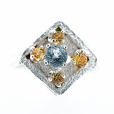 Beautiful Unique Montana Sapphire Ring. The center Sapphire measures .25ct, and is surrounded by four .15ct Multicolored Yellow Orange Montana Sapphires